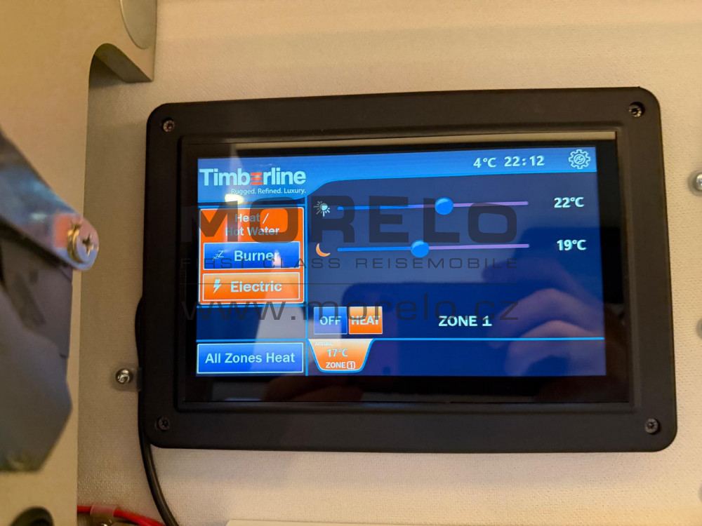 Ovládání volitelně vybraných elektrických spotřebičů, jako je klimatizace, mikrovlnná trouba a myčka nádobí, pomocí střídače. Vzhledem k maximální kapacitě 3680 wattů při 16 ampérech lze elektrické spotřebiče používat pouze střídavě, nikoli současně. Společnost MORELO si vyhrazuje právo odmítnout záruční krytí všech pomocných baterií instalovaných ve vozidle z výroby v případě nesprávného provozu, jako je paralelní provoz, hluboké vybití nebo přetížení.