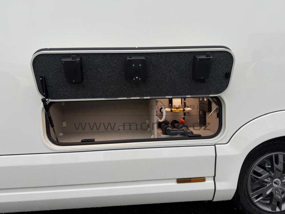 Nádrž na čerstvou vodu v zadní garáži, cca 240 litrů; nádrž na odpadní vodu, cca 200 litrů; nádrž na černou vodu, cca 200 litrů, ve vyhřívané dvojité podlaze